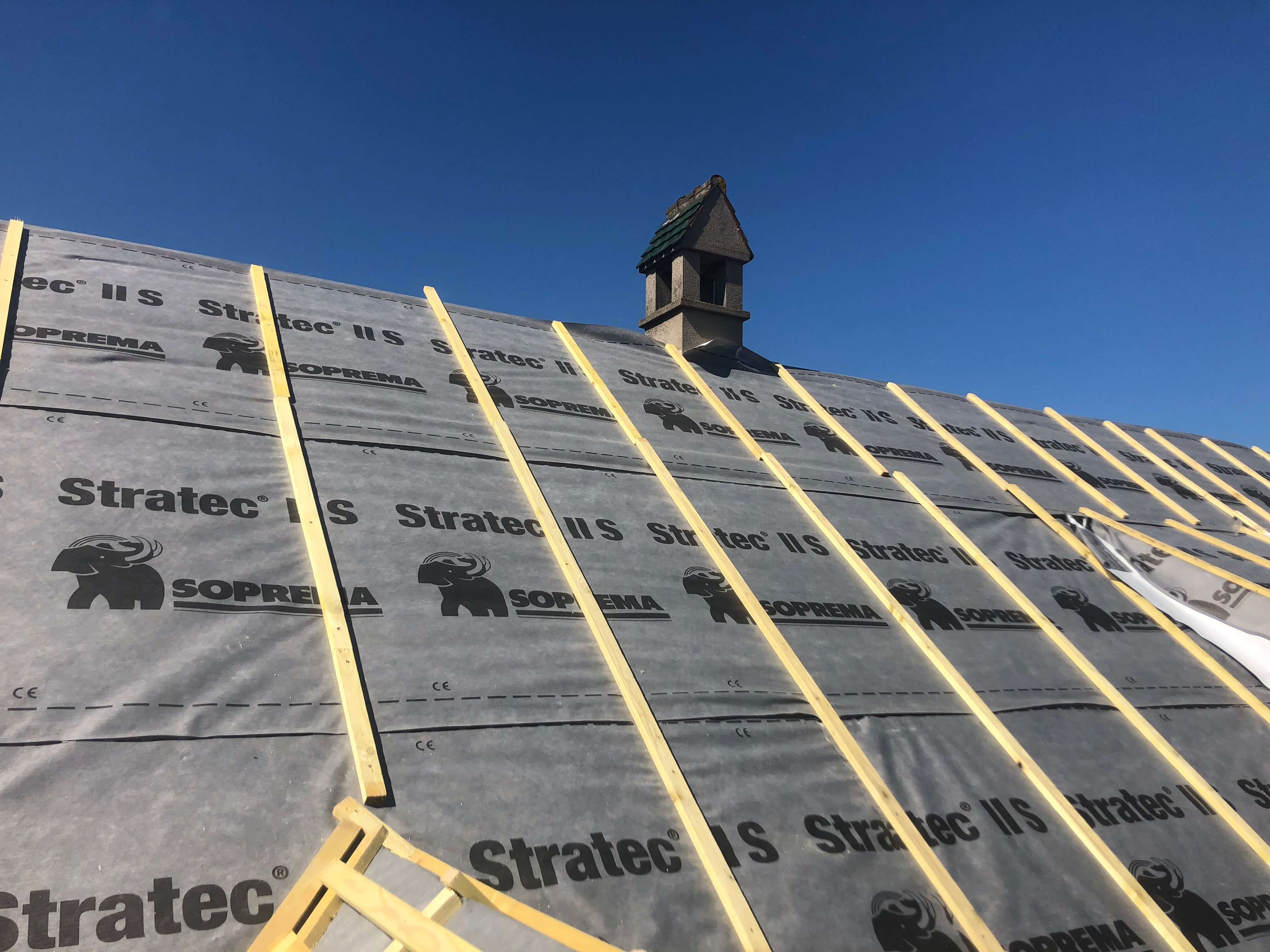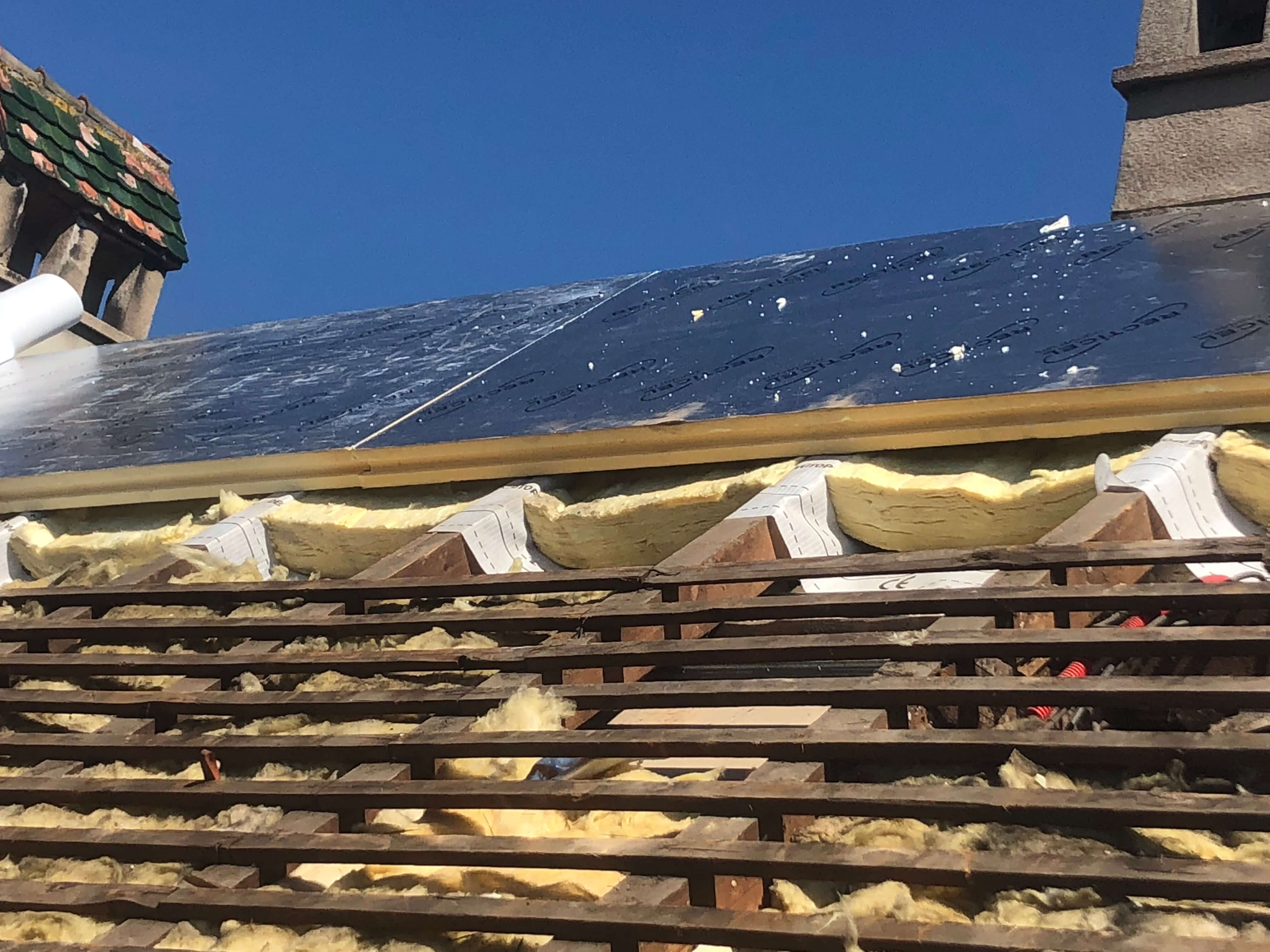 Réfection de la toiture par une mise en place d’une isolation en laine de verre et sarking.