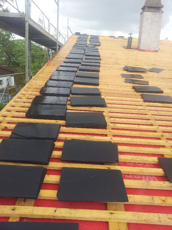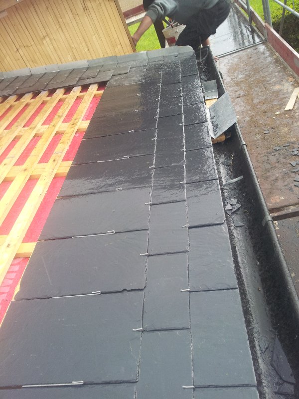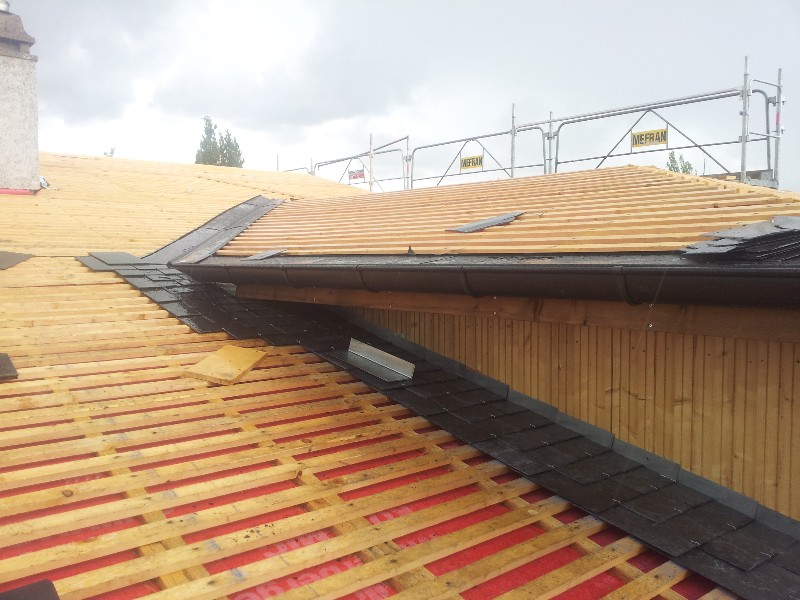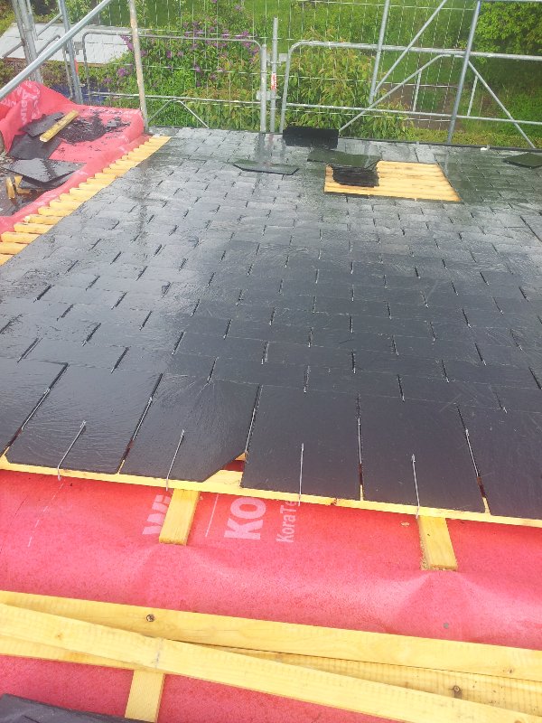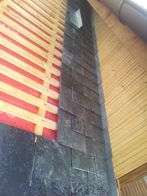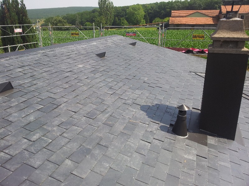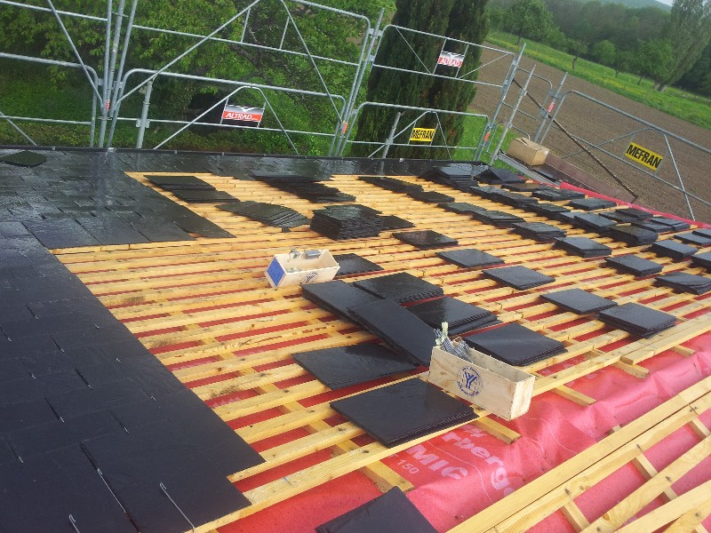 Cette couverture est composée d’ardoises. CBC a réalisé la couverture avec une isolation en toiture de fibre de bois UD Q 11 Homatherm. L’habillage prépatiné est en fixation invisible.